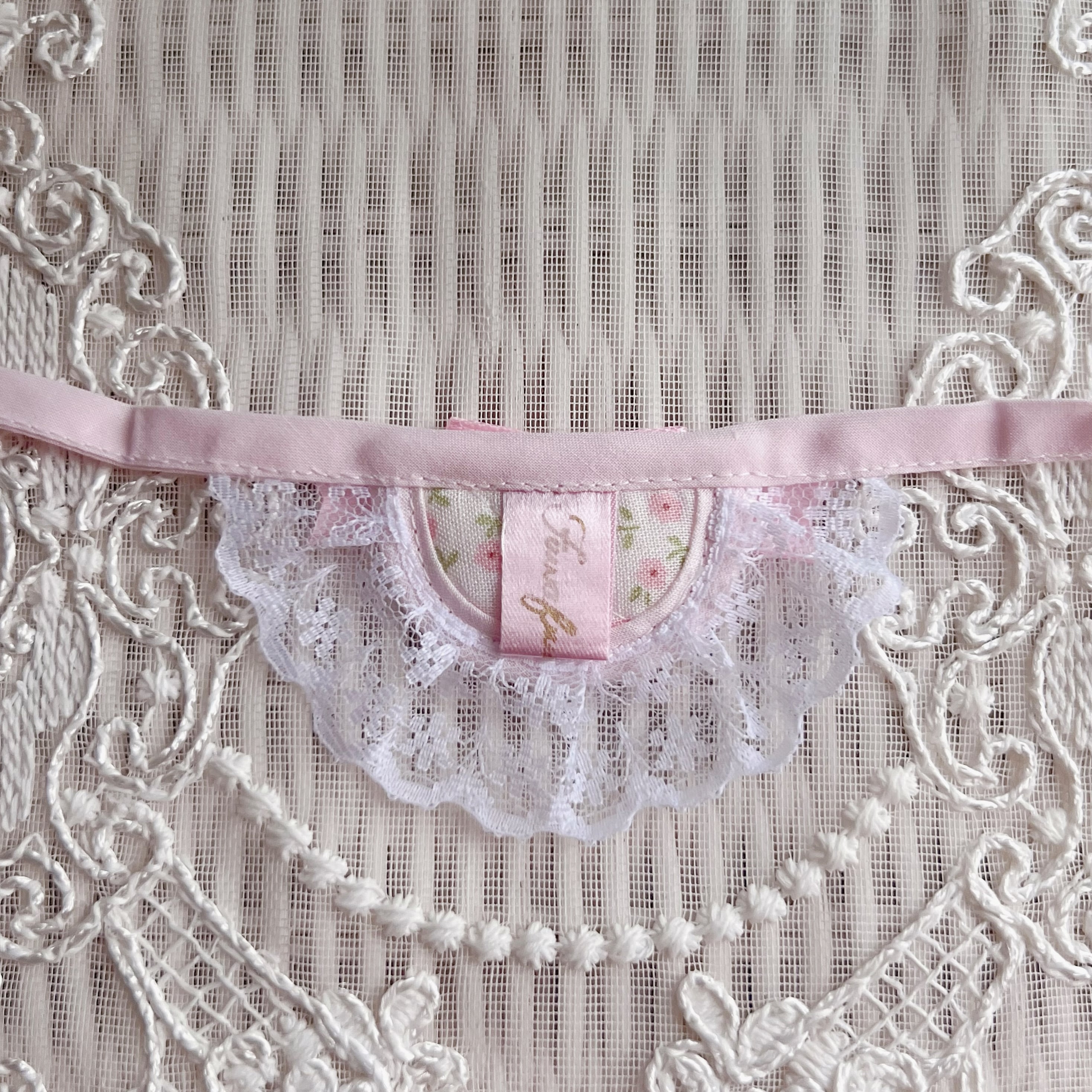 艶感のあるピンクのリボン、砂糖菓子のように繊細なレース、ピンクのお花で紐の先まで甘いスタイ。