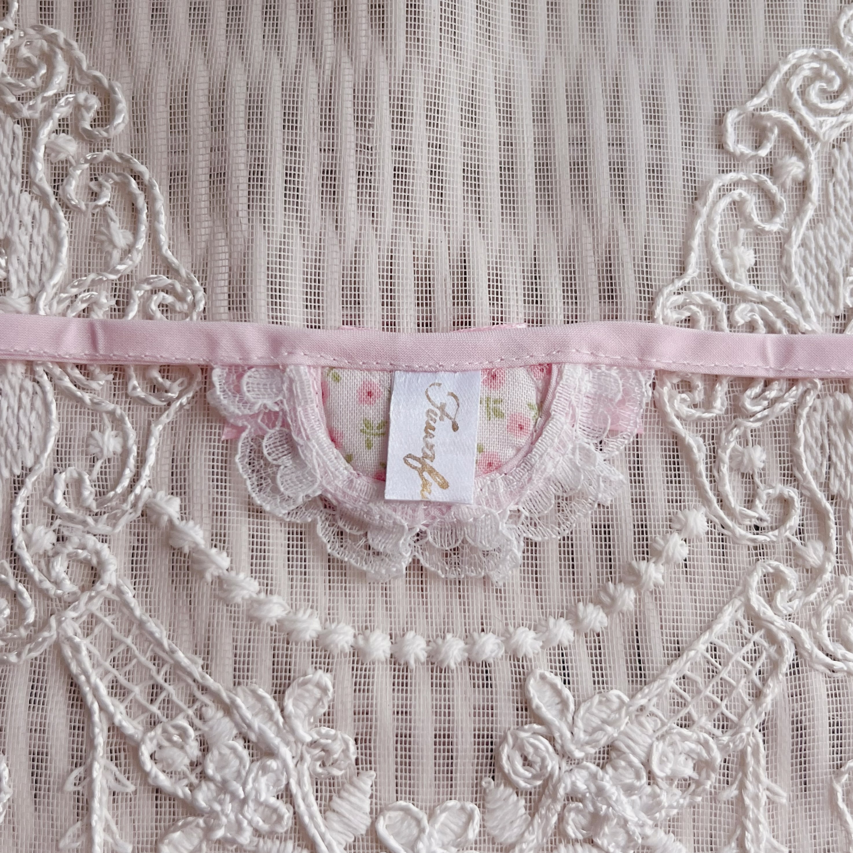 艶感のあるピンクのリボン、砂糖菓子のように繊細なレース、ピンクのお花で紐の先まで甘いスタイ。